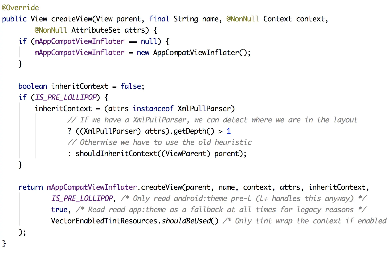 虽然这里看到它通过 API Level 做了区分判断来做具体的实现,但是类似这种 AppCompatDelegateImplVxx 的类,都高版本的继承低版本的。而 AppCompatDelegateImplV9 中,就是通过 LayoutInflaterFactory 接口来实现 UI 控件替换的代理。