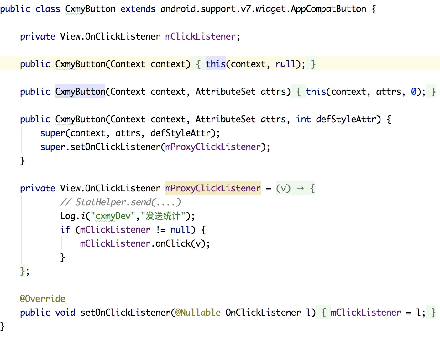 首先我们重写一个 Button 控件,对其中的 onClick 事件做一个代理监听。