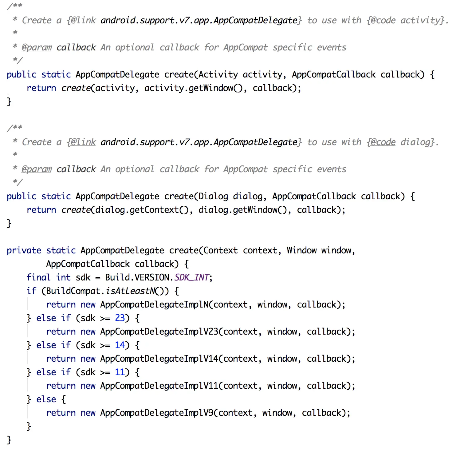 而这个 AppCompatDelegate.create() 方法就是其做代理支持的实现。