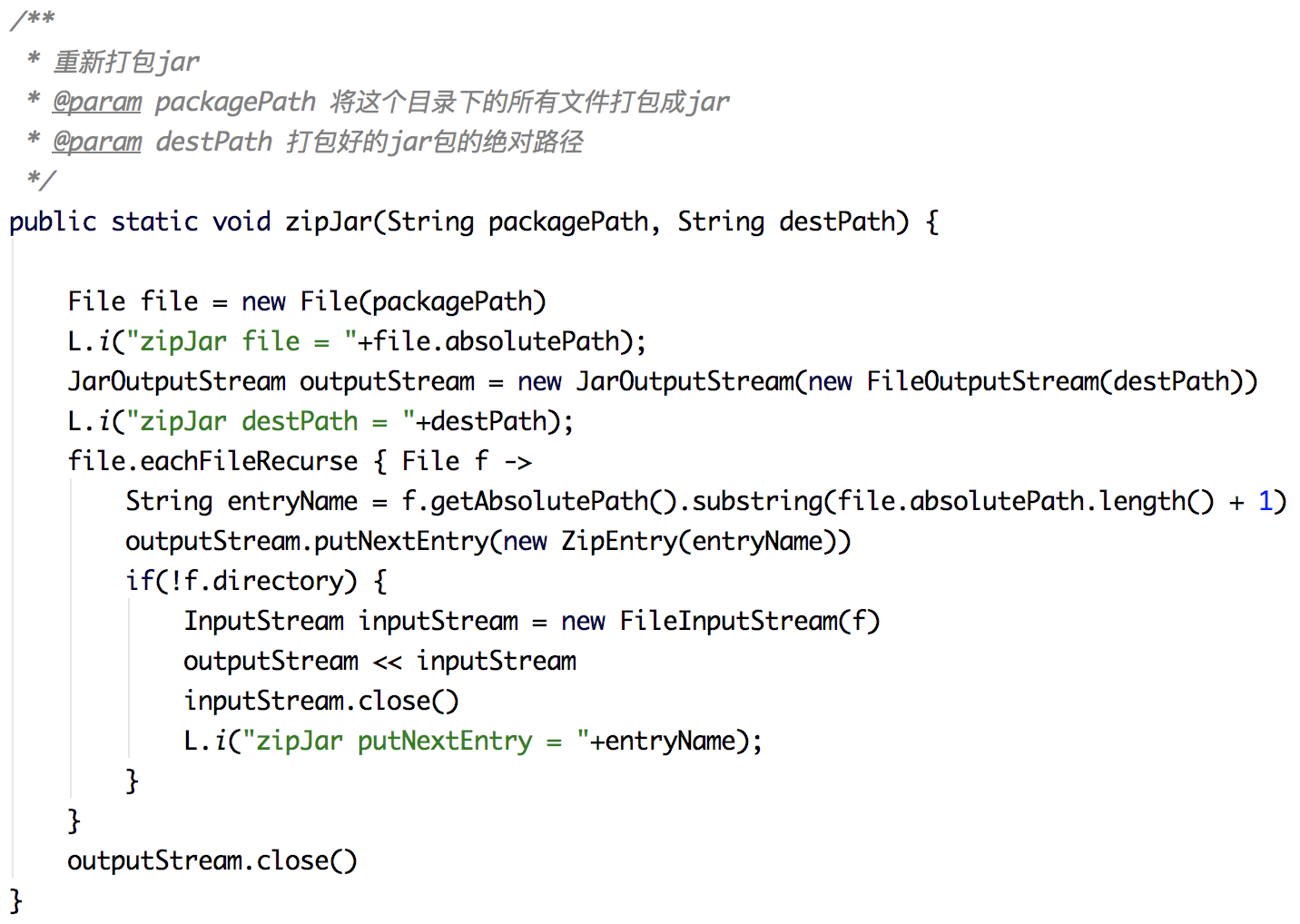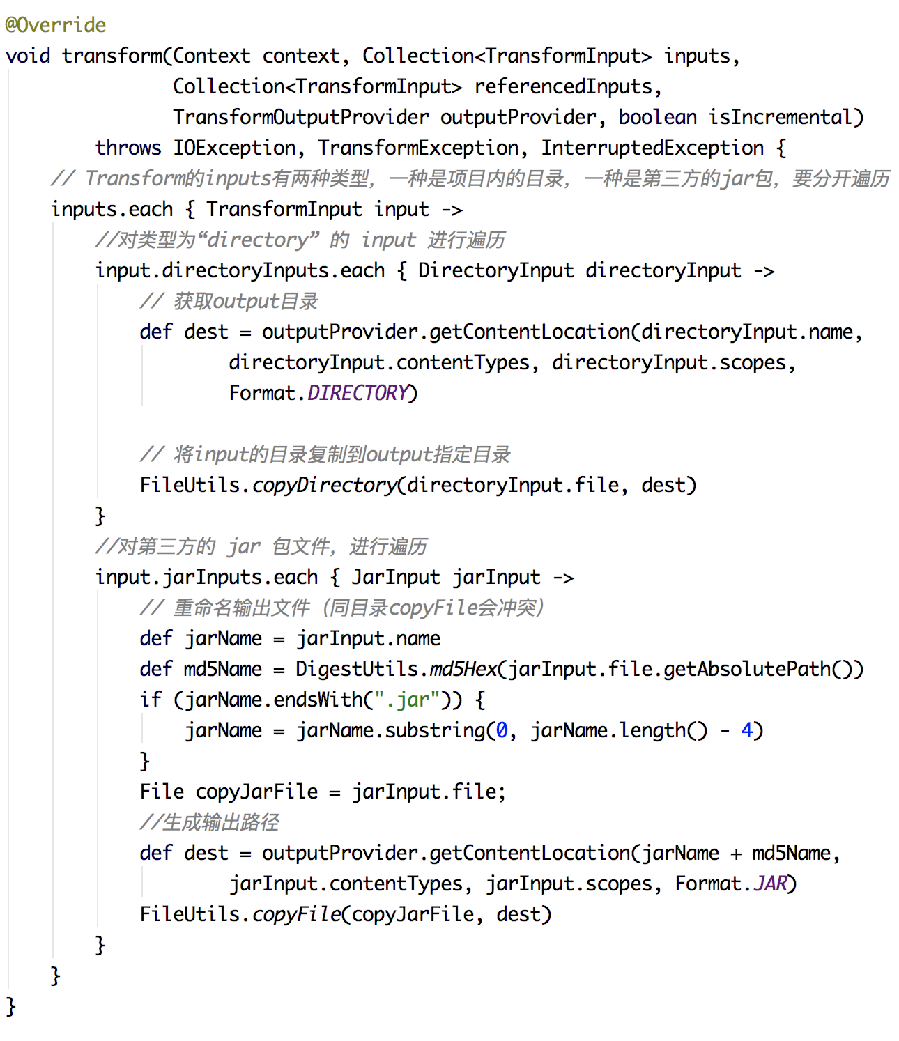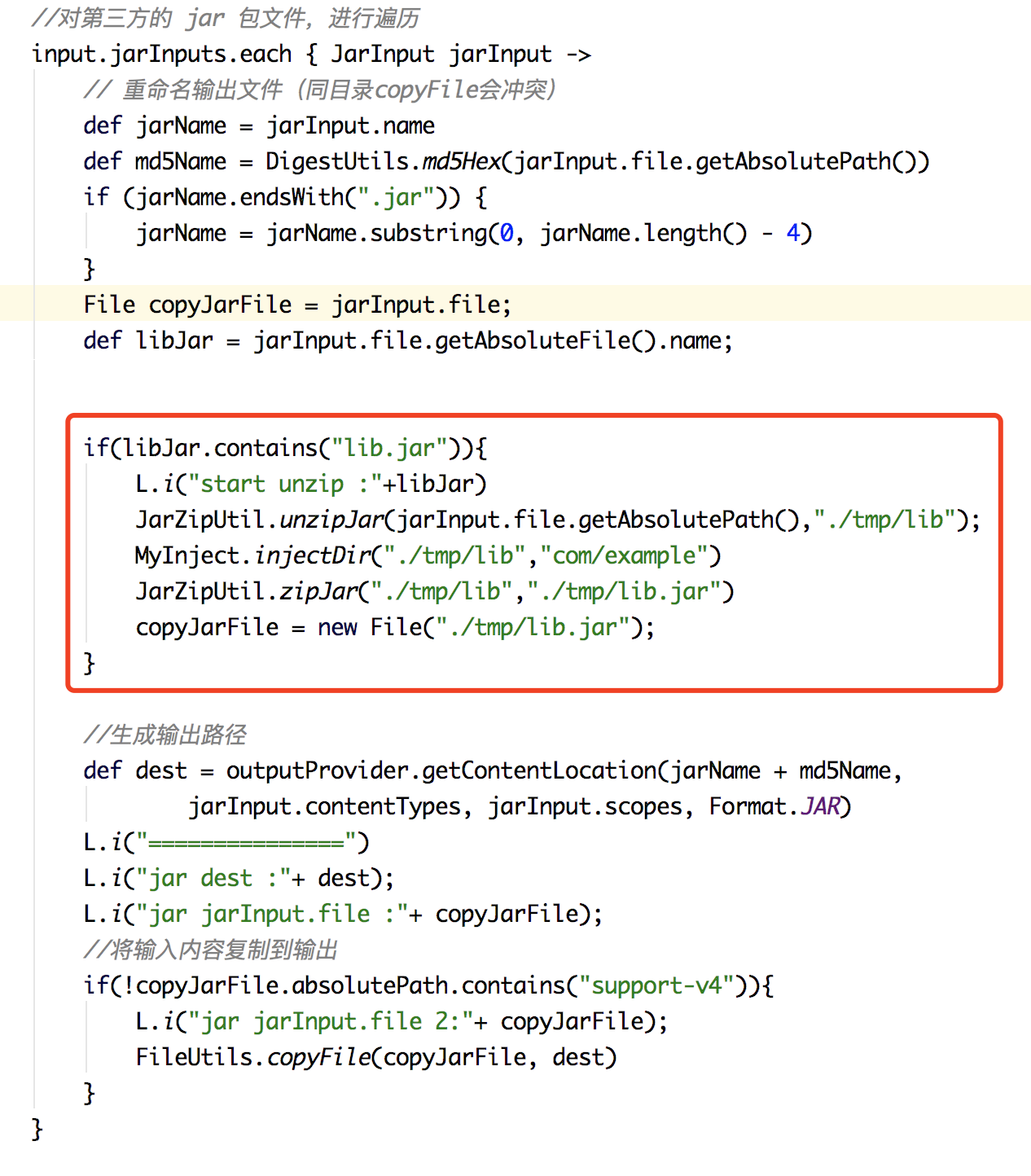 但是这样实际上并没有办法修改第三方库里的类,这个需要我们特殊处理。前面已经提到,在 Transform 中,需要区分当前项目的目录,而针对第三方库的 Jar 包,我们需要先对其进行解压,然后修改完成之后,再压缩回去。