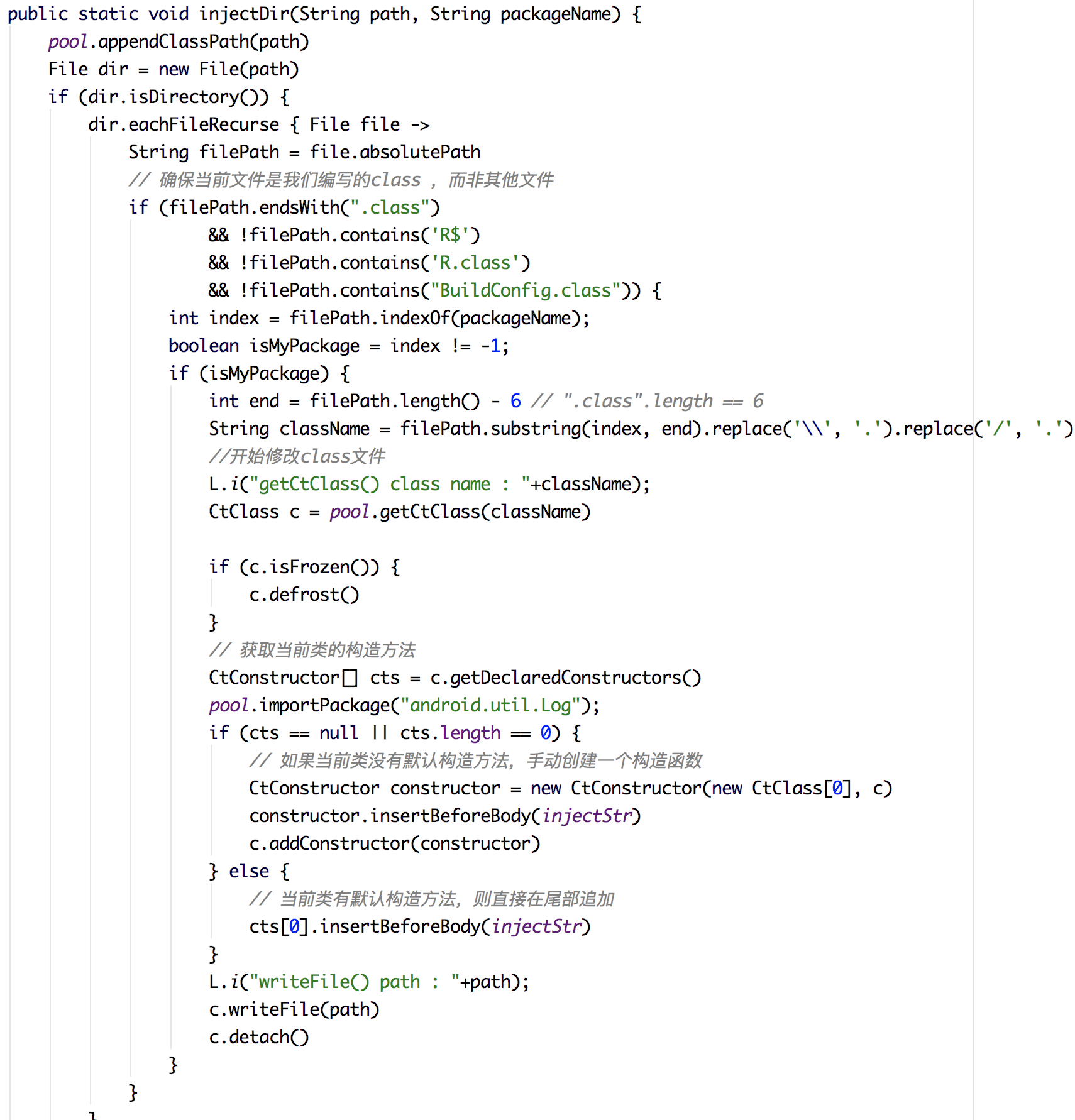 这里查找到需要的 class 文件之后,首先判断是否有构造方法,如果没有构造方法就创建一个,然后在其构造方法内注入一行代码。
