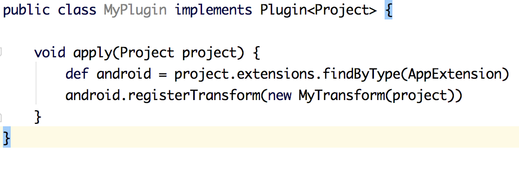 例如上面,就是一个 Plugin 的入口,用到了 Project 来操作 Gradle 的构建过程,在其中注册了一个 Transform,这个 Transform 才是在编译期间修改 class 字节码的关键。