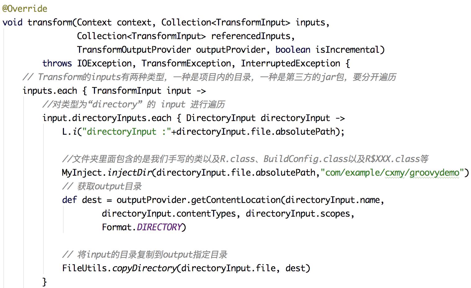 所以我们在上面,使用 registerTransform() 注册了一个我们自己的 Transform ,供我们在编译期间做对应的修改。