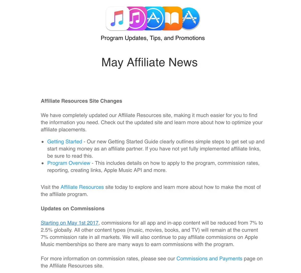 DoNews4月25日消息 (记者 费倩文)苹果公司今天向其联盟计划的成员发出了一封电子邮件通报,称其将对iTunes Affiliate Resource页面进行改进,并调低了佣金率。