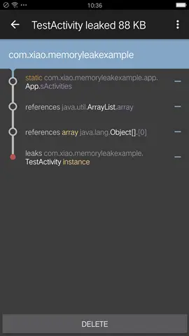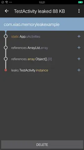 04-25 10:20:46.793 D/LeakCanary: * leaks com.xiao.memoryleakexample.TestActivity instance