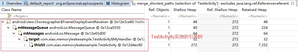 可以看到TestActivity实例存在GC Roots链,TextActivity实例被mMessageQueue.mMessae.target.this$0持有,那么发生了内存泄露,我们可以根据引用链来在代码中找到内存泄露的位置。