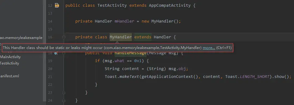 其实,只要我们在设置里面勾选了Lint代码检查(AnroidStudio默认是勾选了的),在写代码的时候就会自动提示可能发生内存泄露。