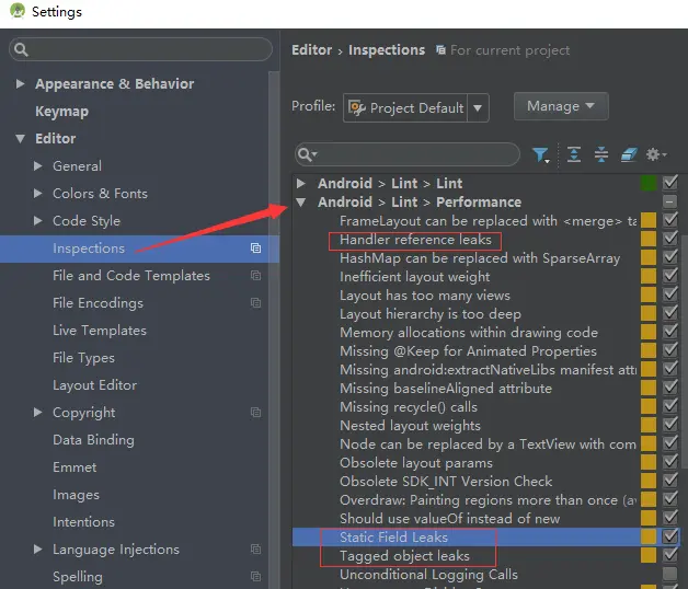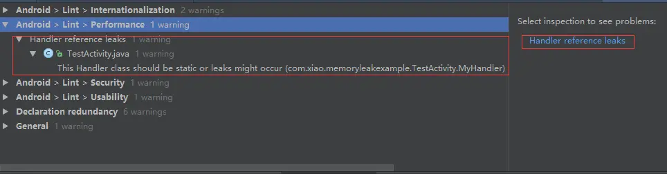 通常在写Handler、静态字段、标记对象等可能存在的内存泄露时,Lint检查工具都会有一个警告提示信息,我们可以根据Lint检查的提示信息来避免这些有可能发生的内存泄露。