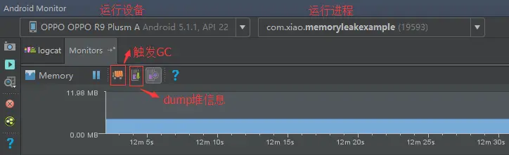 运行工程,在设备上操作app,观察Monitor中内存的变化,点击 initiate GC 触发GC,然后点击Dump Java Heap转出堆信息,稍等片刻,生成hprof文件,生成后会在Studio中自动打开。