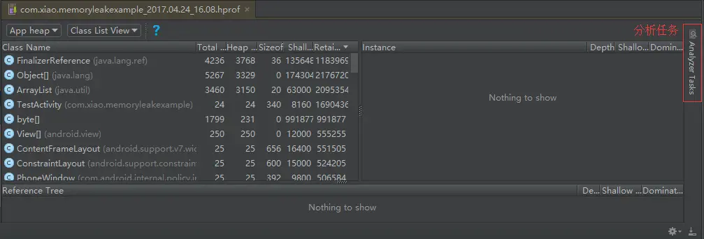 可以根据左侧的引用树,来查找持有Activity引用的位置,从而判断出哪个地方导致了内存泄露。