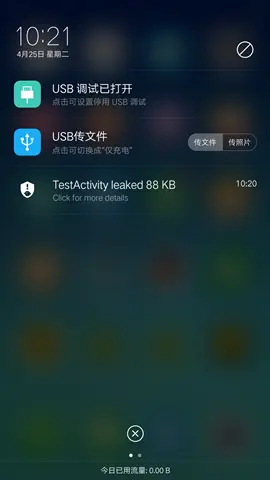 04-25 10:20:46.803 D/LeakCanary: | Class:java.lang.ref.FinalizerReference (always)日志当中展示了详细的内存泄露信息。同时,在运行设备上,会以通知的形式展示内存泄露: