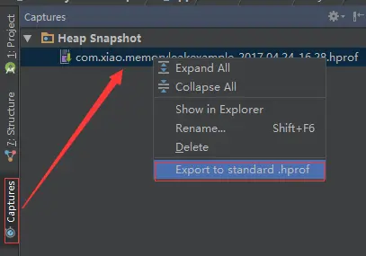 将Android Monitor生成的hprof文件导出为标准的hprof文件(必须这样导出,直接copy出来会报错的):