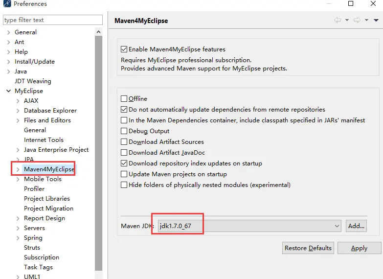 打开myeclipse中的 Window=>Preferences=>Myeclipse=>Maven4Myeclipse