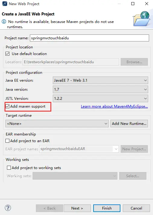 配置项目基本信息,项目名,java EE,java版本,其中记得要勾上Add maven support,这样才会生成带有maven的工程。