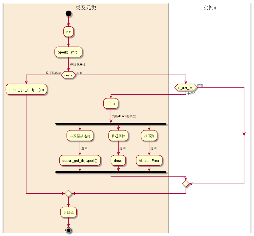 b.__dict__未找到相关属性,则重新回到descr值的判断上。- 若