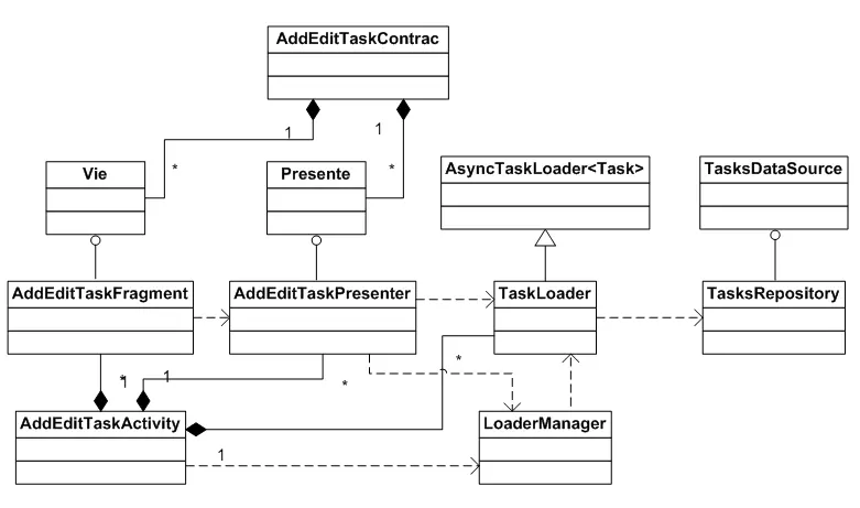 相对于TODO-MVP的基础实现,使用了异步Loader机制的实现,其新建/编辑任务子模块的UML静态结构图如下。