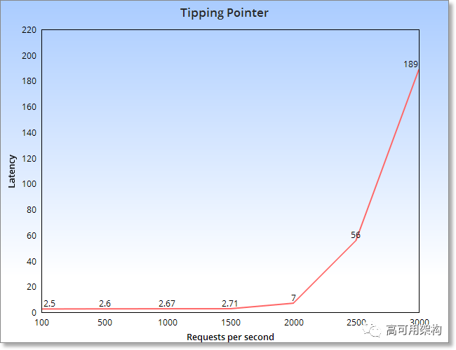 该图表明,在某一点之前,如果不断增加请求数量,延迟将几乎保持不变。然而,达到某个临界点,延迟将开始呈指数级增长。这就是该机器的临界点。