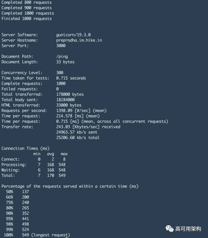 上述命令将运行 3 个 ab 客户端击访问同一个 URL。 这有助于我们消除客户端瓶颈。