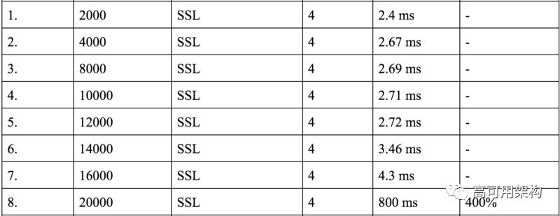 当将整个负载从非 SSL 连接转移到 SSL 连接时,CPU 使用率增加的百分比。CPU 的使用率肯定会增加,这是由于 5 次握手的加长和数据包加密的开销所带来。
