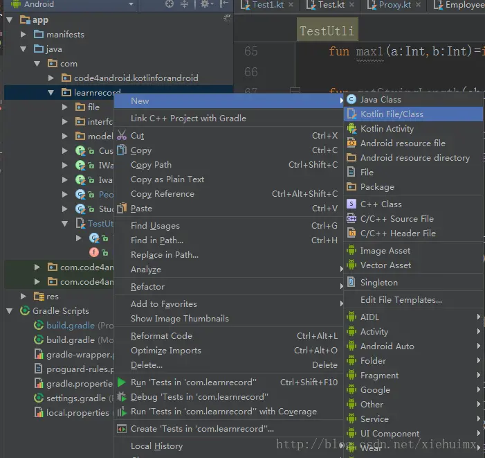 我们由一个简单的"Hello World!"输出程序开始。与新建java文件类似,如下图,我们选择Kotlin File/Class.创建一个Kotlin文件。