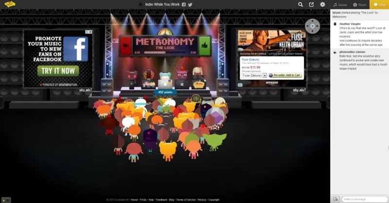 但是,当我使用 turntable.fm 越多,我愈发的开始觉得自己就像一个,呃,失败者。我主要感兴趣的是发现新的音乐,而不是成为一个虚拟 DJ 明星。但是这个平台似乎并没有对成为一个好的听众提供鼓励或激励,在我完全参与到与虚拟室友的互动后没有提供闪亮的奖品。我的化身仍然微小并平庸着,而其他人在慢慢成长,装饰着珠宝,配备着酷酷的动物服饰。