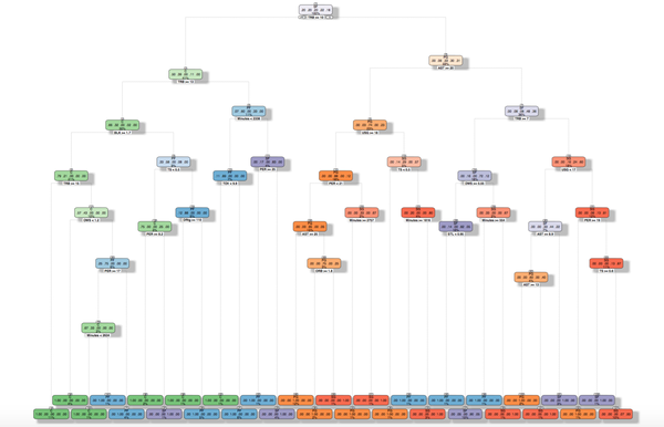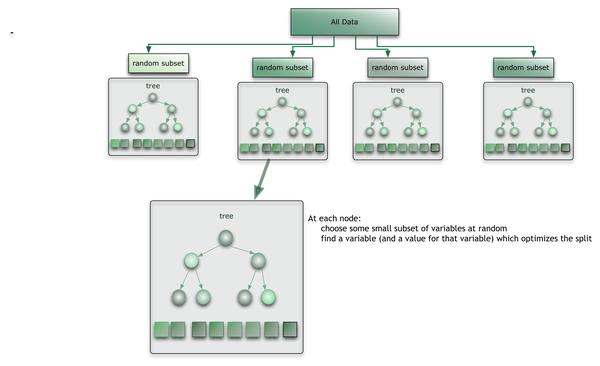 在展示结果之前,我们先来剖析一下模型的训练过程。我们确定要集成的决策树数目为T,第一步是为每一棵树随机抽取一个样本子集,一般为样本全集的2/3。第二步是在树的每个节点上随机抽取m个特征作为特征子集。第三步是树的生成,在每个节点上选择一个最佳的特征进行分支。在下一个节点上继续随机选择m个特征重复以上步骤。