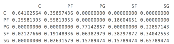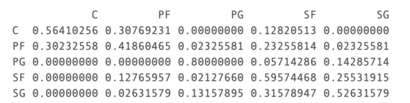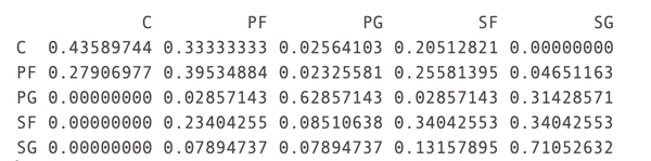 混淆矩阵显示中锋和大前锋预测正确率在50%左右,因为这两个位置往往可替代性很强,混淆的部分也很大。我们也看到了控卫的预测正确率有80%。做的这里我就想随机森林的结果一定会更好。