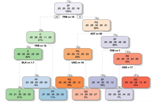 决策树类似于一个向你问问题的机器。比如我们有一个新球员,要预测他的位置。决策树就会问:“它的总篮板数是多少”,然后你给它一个答案,它向你问的下一个问题是基于上一个问题的答案,直到他问的问题足够多以后他不会再问了而是告诉你这个球员会打什么位置。决策树很好理解而且做出来的图也很直观。