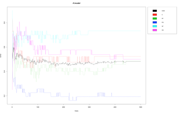 从混淆矩阵显示结果来看,随机森林的预测结果明显优于决策树,尤其是控球后卫的预测结果较好,但是对大前锋和得分后卫的预测精度就有些下降了。我的数据集还是有些太少,如果我们用更多的数据,随机森林的效果必然有更高的提升。在我下一步的计划中,我想从50个赛季中抓取数据,然后做一个类似的分析看看最终结果如何。