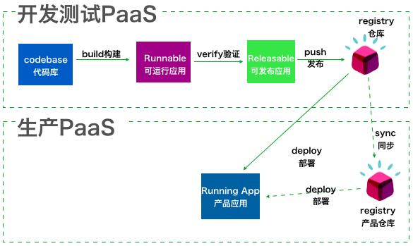 生产环境与开发/测试环境基于同一个技术栈(运行时环境上有具体的差别),开发测试PaaS中构建出的可运行应用可以直接部署到生产环境;