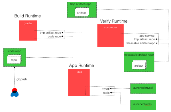 后台服务针对可运行应用自动运行“验证门”测试,测试通过后,这个版本的可运行应用即被标记为可发布应用,并被存入构建产物仓库;