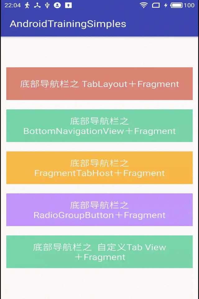 本文总结了实现底部导航栏的5种方式,其中TabLayout 和 BottomNavigationView 是Android 5.0 以后添加的新控件,符合Material 设计规范,如果是Materail 风格的,可以考虑用这两种实现(TabLayout 使用更多的场景其实是顶部带Indicator的滑动页卡),其他两种方式FragmentTabHost 和RadioGroup 也是比较老牌的方式了,在4.x 时代就大量使用,是一般底部导航栏的常规实现。最后就是自定义View来实现了,自定义View稍显麻烦,但是可定制度高,如果有一些特殊的需求,可以用这种方式来实现。
