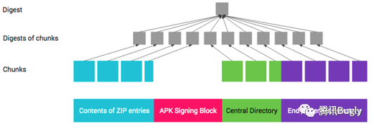 首先,将上述APK中文件内容块、中央目录、EOCD按照1MB大小分割成一些小块。
