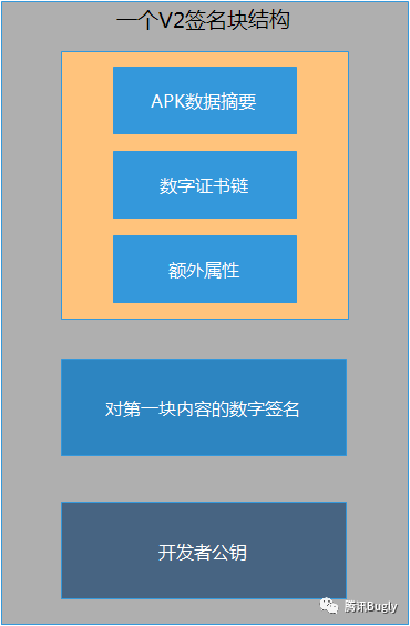 类似MF文件、类似SF文件和开发者公钥一起组装成通过单个keystore签名后的v2签名块(第三列第一行)。 -