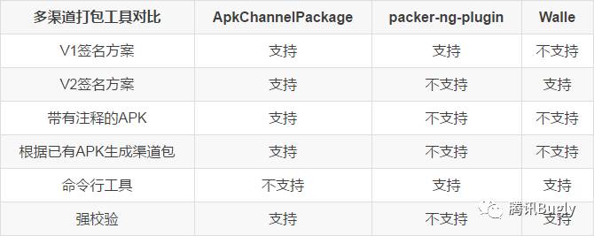 目前市面上的多渠道打包工具主要有packer-ng-plugin和美团的Walle。下表是我们的ApkChannelPackage和它们之间的简单对比。