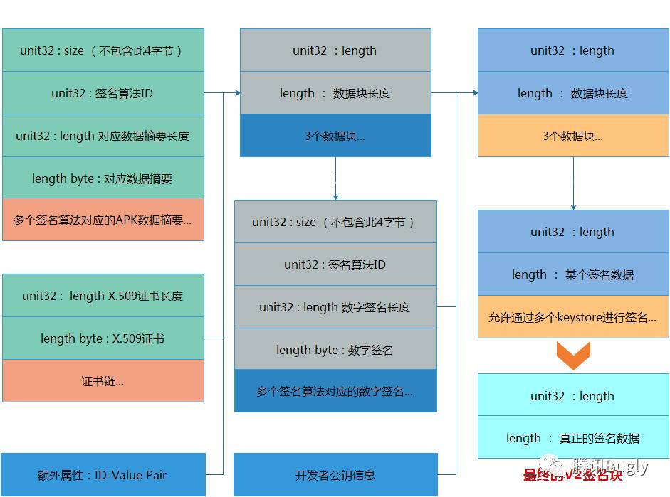 最后,把多个keystore签名后的签名块组装起来,就是完整的V2签名块了(Android中允许使用多个keystore对apk进行签名)。