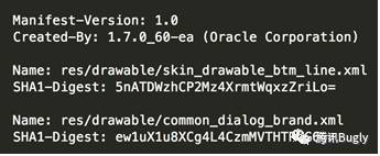 其余的普通属性则和MANIFEST.MF中的属性一一对应,分别记录了对应数据块的数据摘要的Base64编码。例如:CERT.SF文件中skin_drawable_btm_line.xml对应的SHA1-Digest,就是下面内容的数据摘要的Base64编码。