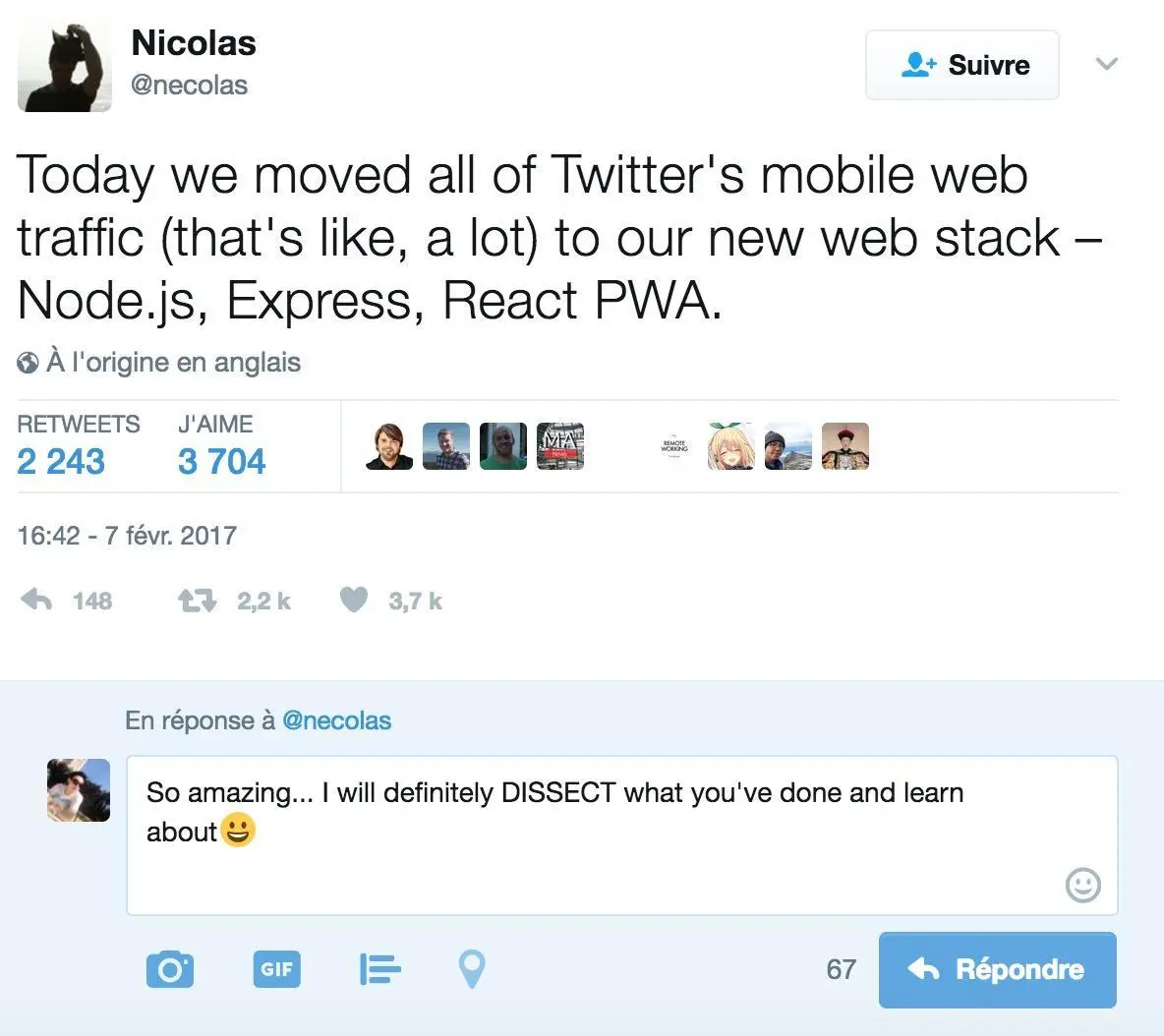 前几天刷Twitter,发现Nicolas(Engineering at @twitter. Technical Lead for Twitter Lite)发布了这么一条推文: