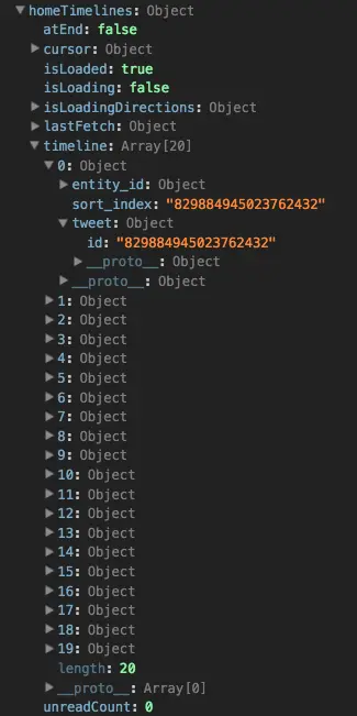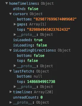 同时, homeTimelines里面还记录了isLoadingDirections.bottom和isLoadingDirections.top来表示数据加载的触发源头。