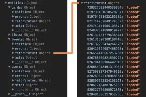 当你打开这其余三项的时候,会发现这三项与entities/tweets保持在相同的结构,他们都有一个fetchStatus的data table,key为tweet id, value为加载状态,据统计一共有一下几种: