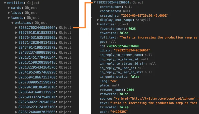 一条tweet内容的数据信息全部存储在entities/tweets/entities中,entities/tweets/entities可以理解为一个normalized的data table,它存储了所有tweets推文的信息;