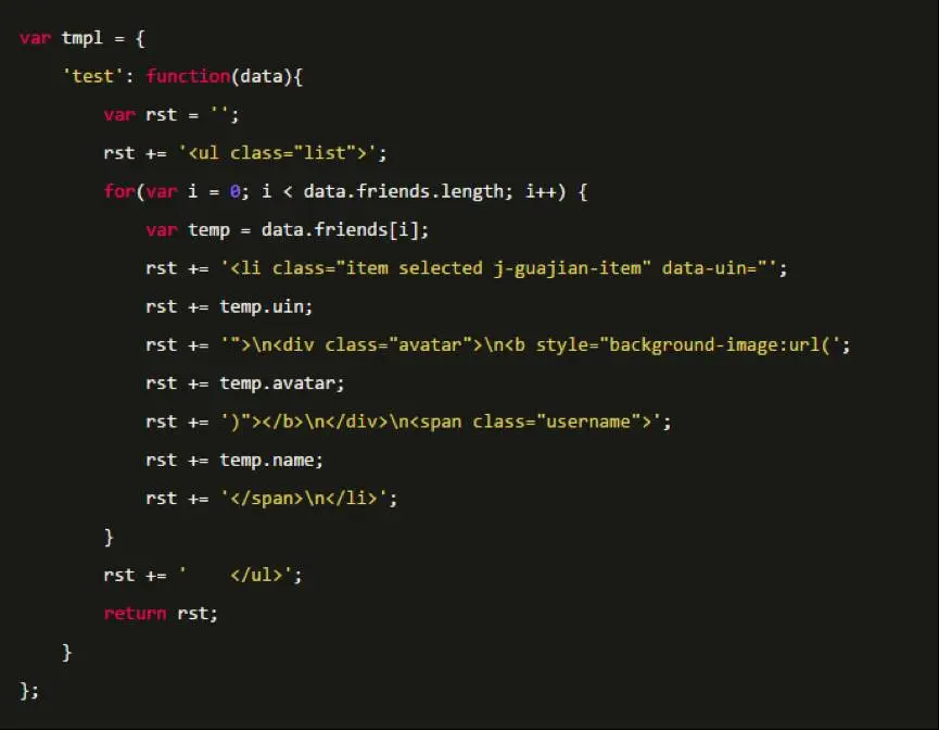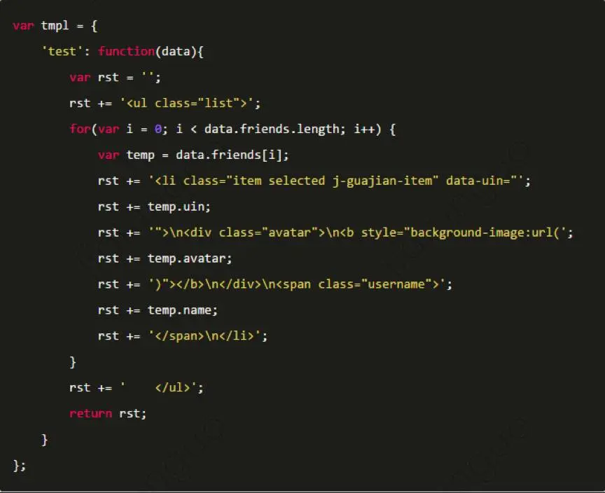 JS中执行 tmpl.test(data) 即可拿到渲染出来的HTML片段。tmpl.test 就相当于是一个test模板的render函数。