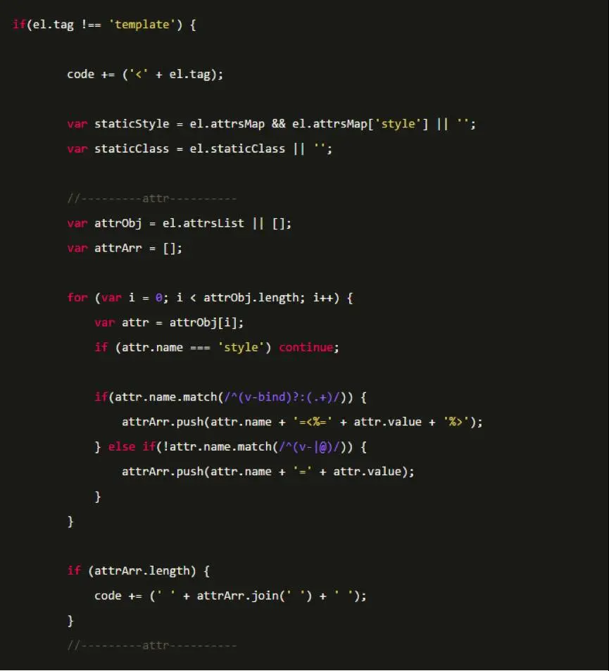 用这个正则表达式,可以将模板代码中的 JS逻辑与JS属性值 分割出来,再通过'引号来将静态dom串包裹,拼接,最后加上函数的头尾,就能得到一个完整的render函数。编译过程可以通过预编译在线下实现,也可以在线上实时动态完成。