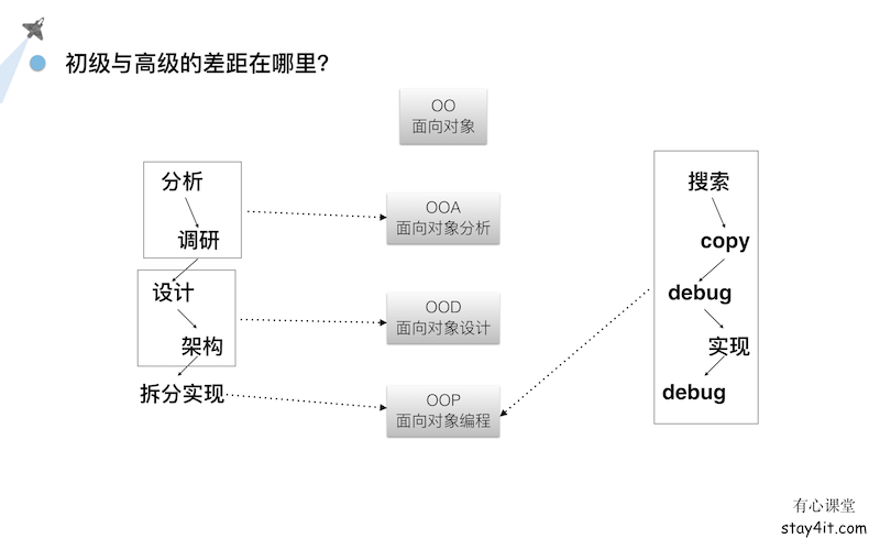 对比下初中级呢,他们的关注点更多的放在OOP上,在具体代码实现上。这样就不太能全观整体业务的流转和边界,无法预见需求未来可能发生的变化,仅仅做些重复劳动力对提升开发效率是没有任何帮助的。