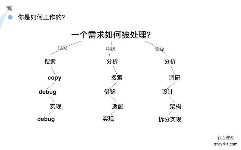 一个需求如何被处理,从初级开发工程师到中级再到高级、架构师他们处理的方式流程是不一样的。