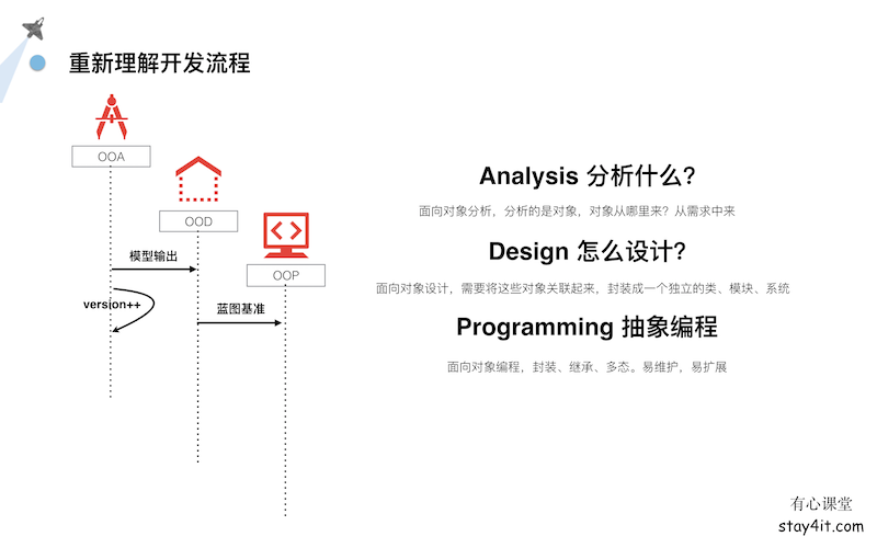 高效开发Stay觉得应该分为,OOA、OOD、OOP,跟我们刚才讲的那个是一样的。先得有需求分析,再做流程设计,最后才是代码实现。