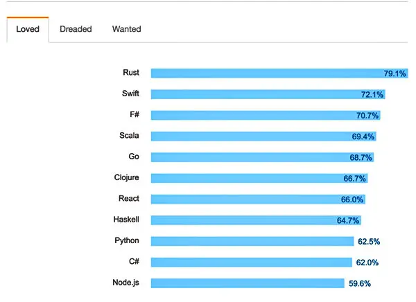 在2016年Stack Overflow发布的开发人员调查结果中,我们也收获了一些信心。在最爱语言的调查中,Scala排在了第四名: