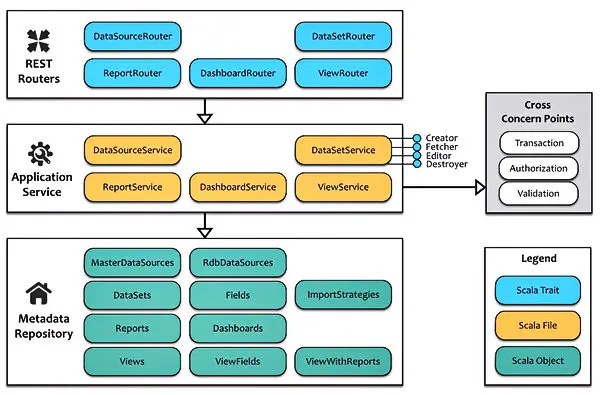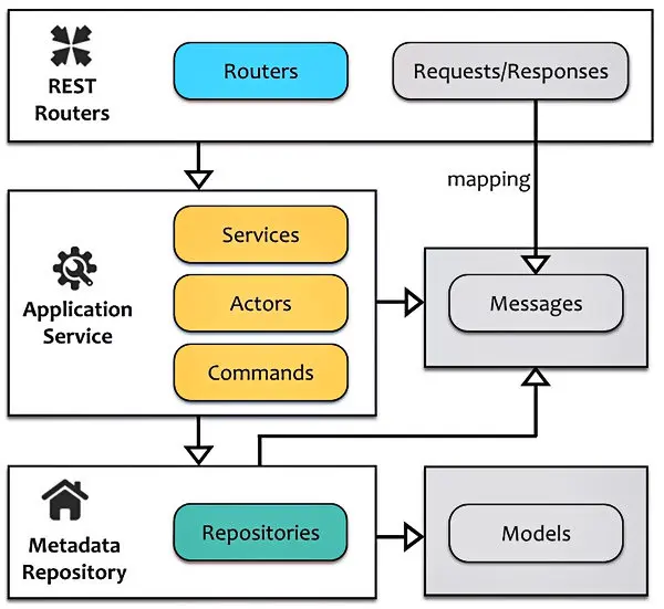 针对元数据的处理逻辑,我们将之分为职责清晰的三层架构。自上而下分别为REST路由层、应用服务层和元数据资源库层。