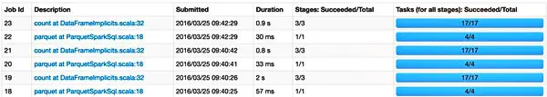 观察执行count操作的job,显然第一次执行SQL时的耗时最长,达到2s,而另外两个job执行的时间则不到一秒。