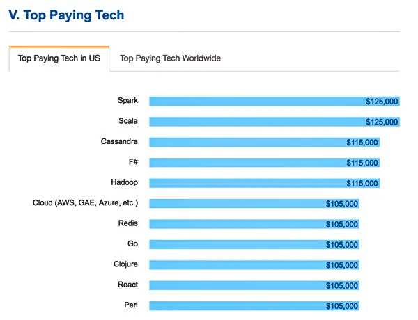在Top Paying Tech调查中,在美国学习Spark和Scala所值不菲,居然并列冠军: